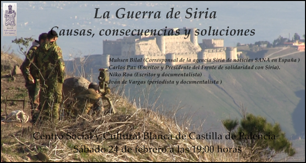 Posteriormente tomó la palabra el escritor Niko Roa, experto en las diferentes facciones que pueblan Oriente Medio. Roa explicó a los asistentes quienes son en verdad los diferentes grupos políticos, religiosos y militares presentes en la zona, describiendo algunas de las razones que causaron las mal llamadas "Primaveras Árabes". insistió Roa en la necesaria participación de occidente (incluido Israel), como las monarquías arábigas; y esto tanto a la hora de propagarlas y publicitarlas, como en todo lo concerniente a la capitalización y organización de grupos terroristas como Al-Qaeda, DAESH o Al-Nusra. Frente a ellos, y defendiendo tanto su independencia nacional, como sus derechos religiosos, políticos y culturales, Siria ha contado además de con la ayuda de Irán (a quien Roa calificó como el gran objetivo a derribar), las milicias libanesas de Hezbollah, y con la inestimable ayuda de Rusia que ha resultado a la larga definitiva para enderezar la situación.